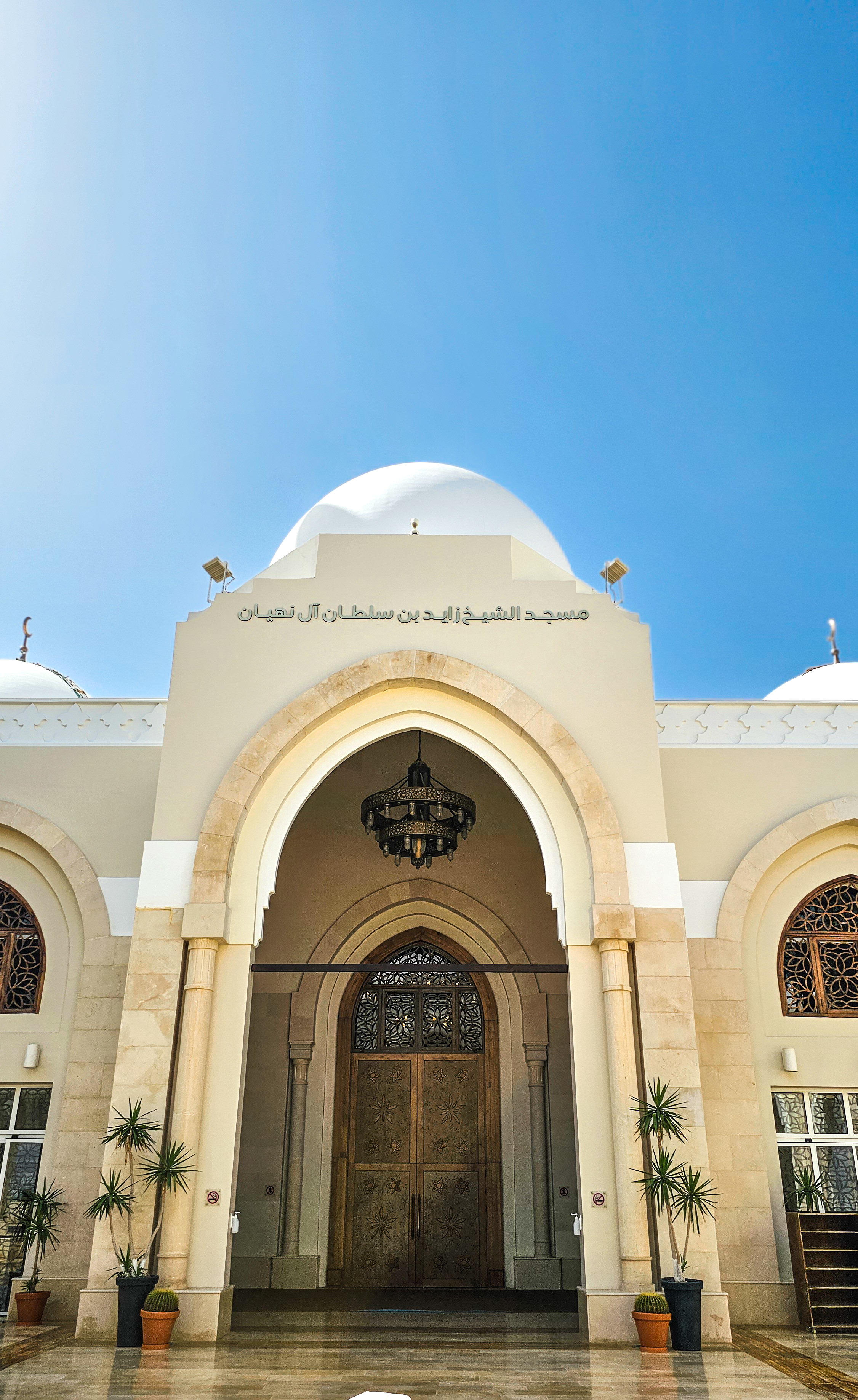 مسجد الشيخ زايد في العقبة – في ختام رحلة الغوص ومن اشتراطات السلامة أن لا أسافر بعد الخروج من آخر غوصة لمدة 24 ساعة لذلك بحثت قبل السفر عن أماكن استطيع زيارتها في يومي هذا. وجدت في بحثي على الخريطة صوراً لمسجدٍ كبير في منطقة خارج المدينة قليلاً وإذ بالاسم يفاجئني “مسجد الشيخ زاي بن سلطان آل نهيان”. المفاجأة أني لم أسمع به قبلاً رغم بحثي عن المساجد باسم الشيخ حول العالم. عند مدخل المسجد الذي له بوابة خارجية مشابهة لبوابة مسجد الشيخ زايد الكبير في أبوظبي جاءني وبادرني بالسؤال مسؤول الأمن “السلام عليكم، من وين الشيخ؟” “من الإمارات” بعد إجابتي رفع يده بقوة ووضعها على رأسه وهذي في ثقافتنا تعبير عن التقدير والاحترام للشخص المقابل… وبعدها انطلقت مع المرشد الخاص بالمسجد في جنبات المسجد والذي كما يقول “كل ما إجى سايح بيقول أنو هذا المسجد نسخة مصغرة لكن مطابقة للمسجد الكبير في أبوظبي